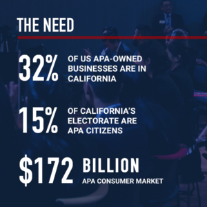Today, APA communities are the fastest growing ethnic group across the nation. Additionally, more than one-third (5.7 million) of the United States’ APA population resides in California. California is also home to the largest number of APA-owned businesses (32% of the total in the nation) and has a consumer market of $172 billion. With the APA population comprising nearly 15% of California’s electorate, the APA community could potentially decide the outcome of the 2018 elections.