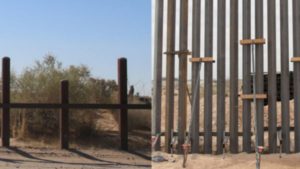 图左是目前美国边境所使用的车辆阻隔带,图右是全新升级之后在建的边境墙模型。