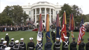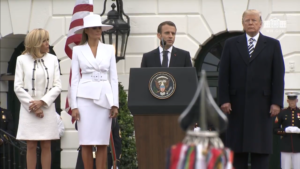 全美电视台国际频道讯,特朗普总统及第一夫人在白宫举办仪式,欢迎法国总统马克龙及夫人访美。