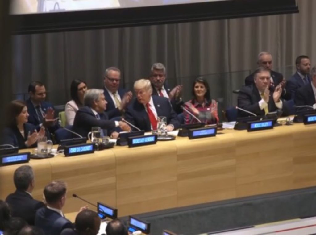 25日早晨,特朗普总统和蓬佩奥国务卿一起出席了联合国秘书长古特雷斯举办的工作早餐。