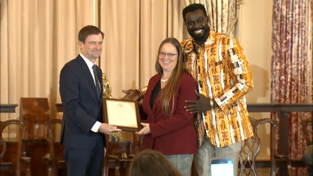 AMTV华盛顿讯,10月5日下午美国国务院经济商业助理国务卿玛尼莎·辛格和政治副国务卿戴维·黑尔在国务院本杰明·富兰克林厅颁发今年的“杰出企业奖”。