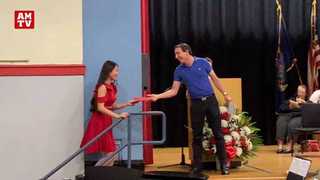 纽约讯,在迎接父亲节之际,6⽉13日纽约皇后区贝赛MS74中学同学与家⻓们迎来了期末的喜庆活动:毕业前的优秀学生颁奖典礼,他们集中在学校礼堂屏住气,激动的期待着校长与老师们公布谁能获奖的喜讯。