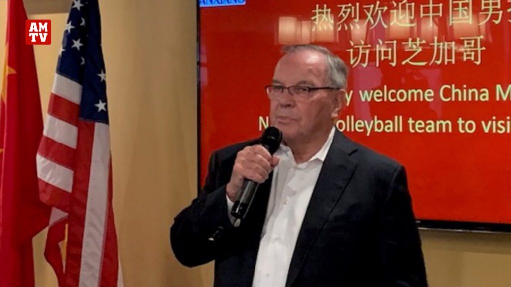 芝加哥讯,6月19日美国中国总商会芝加哥商会在芝加哥市举办欢迎中国男排国家队来芝参加四国联赛招待会,参会嘉宾包括芝加哥前市长戴利,芝加哥总领馆赵建总领事,万向美国集团总裁、美中总商会芝加哥会长倪频,芝加哥大学排球队,西北大学排球队,伊利诺伊大学排球队,芝加哥商会执行总监李洁以及商会会员 -中国检验认证集团、中车四方、南方航空、东方航空、光华建材、Locke Lord等欢聚一堂,欢迎中国男排国家队来芝,并预祝他们在即将到来的四国男排联赛取得好成绩。