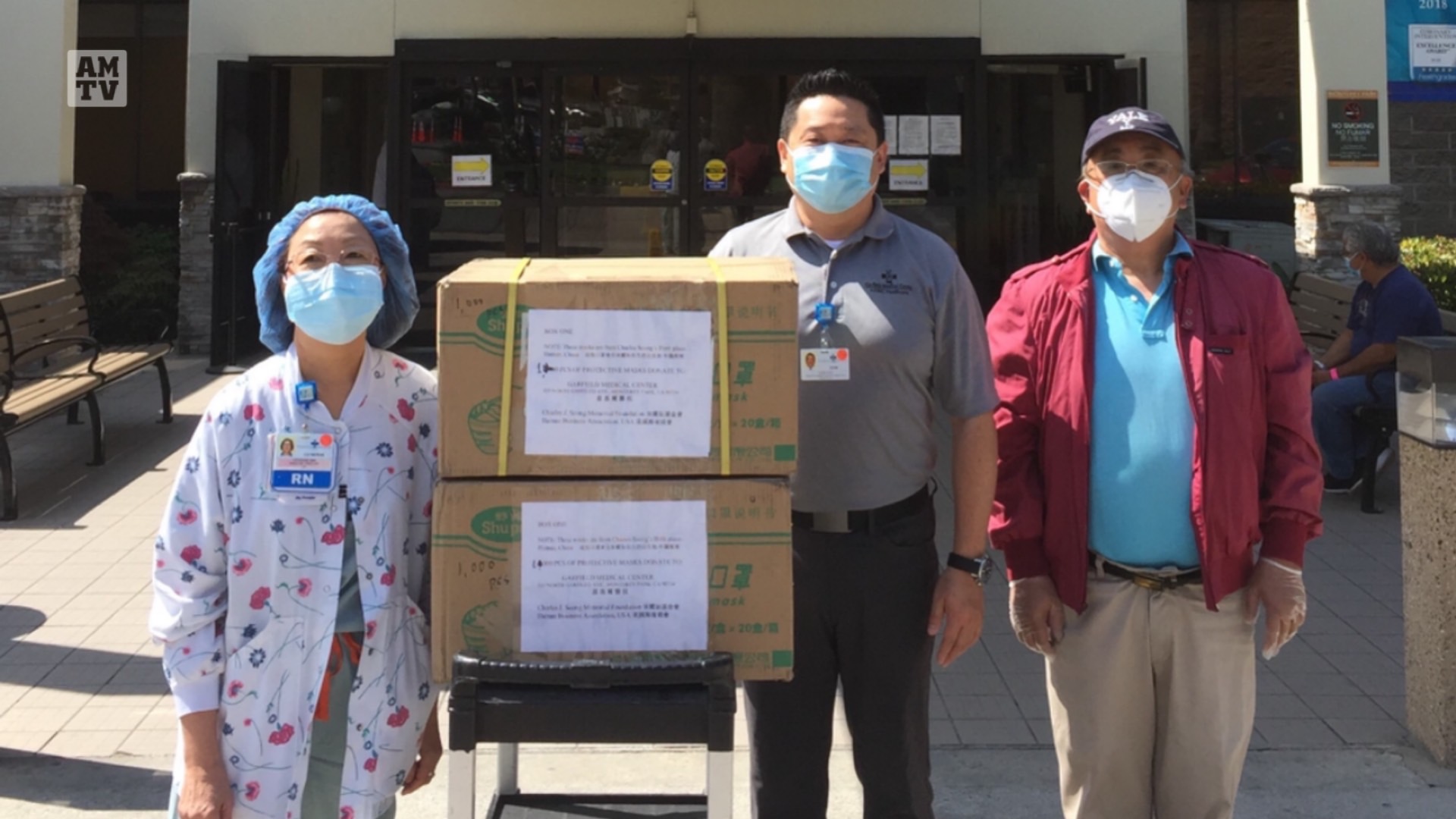洛杉矶5月1日讯,美国海南商会常务副主席、秘书长林师雄代表宋耀如基金会、美国海南商会(海商会)将2千个一次性口罩专程送到位于蒙特利公园市的嘉惠尔医院,该院的资深行政部主任约翰·卓、产科副主任凯瑟琳·麦及产科护理长吴张淑贞等人代表医院接受这批口罩。