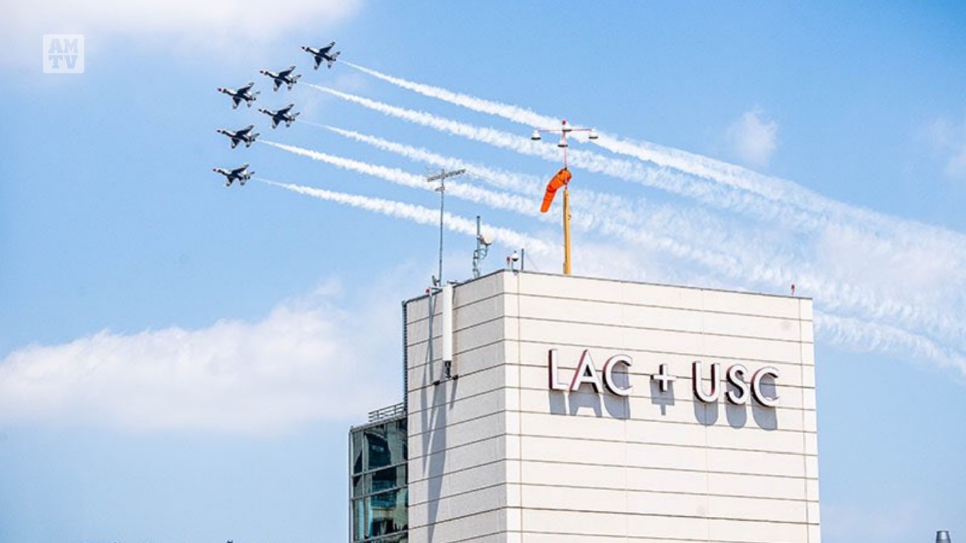 洛杉矶讯(AMTV),美国空军雷鸟飞行表演队周五在洛杉矶、奥兰治县和南加州其他地区进行了空中飞行,以表彰当地抗击新冠病毒的一线工作人员,向前线抗疫人员致敬。