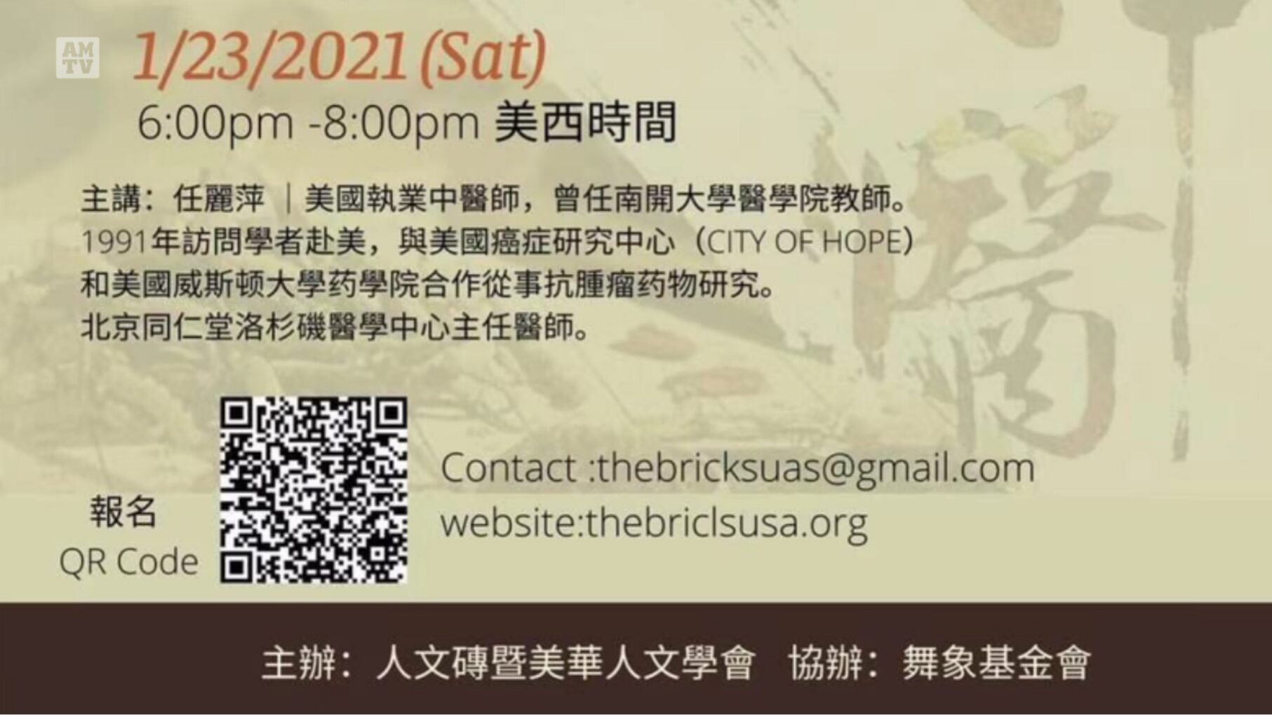 洛杉矶讯,人文砖美华人文学会将于1月23日周六晚6:00至8:00,举办中医药新视野李时珍五百年线上讲座,欢迎华人朋友参加收看。该线上讲座由任丽萍中医师主讲。