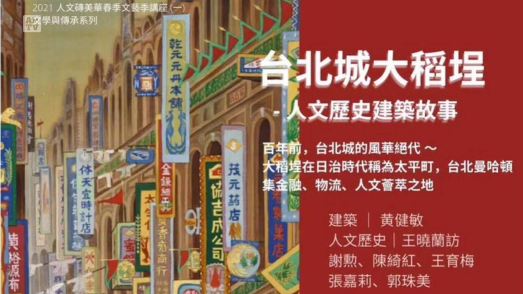 据文砖美华人文学会介绍,2月6日的讲座是“台北城大稻埕-人文历史建筑的故事”,包括历史建筑:黄健敏建筑师;人文历史:王晓兰,访谈谢勲、陈绮红、王育梅、张嘉莉、郭珠美,在2021春节期间,一起回顾当年大稻埕的人文历史建筑繁荣景象,认识百年前台北城的风华绝代。大稻埕在日治台湾时代称为太平町,像是台北曼哈顿,集金融、物流、人文荟萃之地。