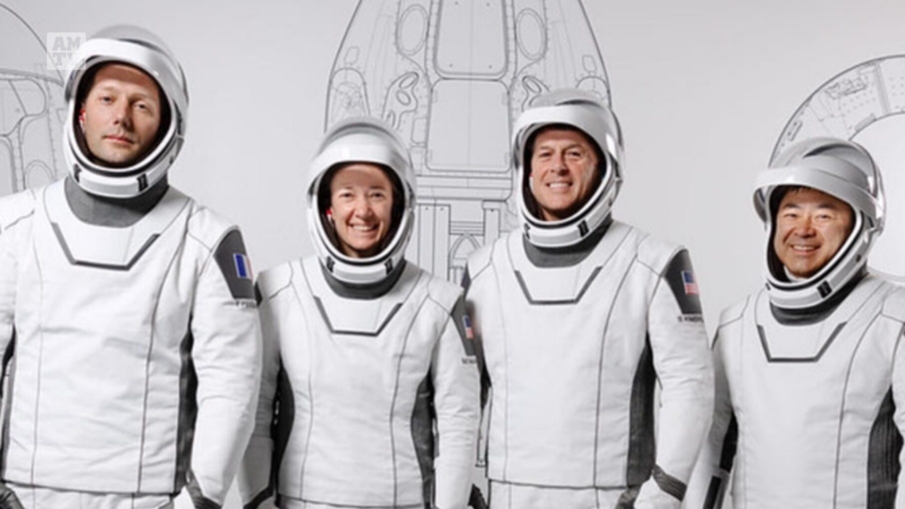 图片:(从左至右)欧洲航天局宇航员托马斯·佩斯凯 (Thomas Pesquet)、美国宇航员梅根·麦克阿瑟 (Megan McArthur)、指挥官谢恩·金布罗 (Shane Kimbrough)和日本宇航员星出彰彦(Akihiko Hoshide)