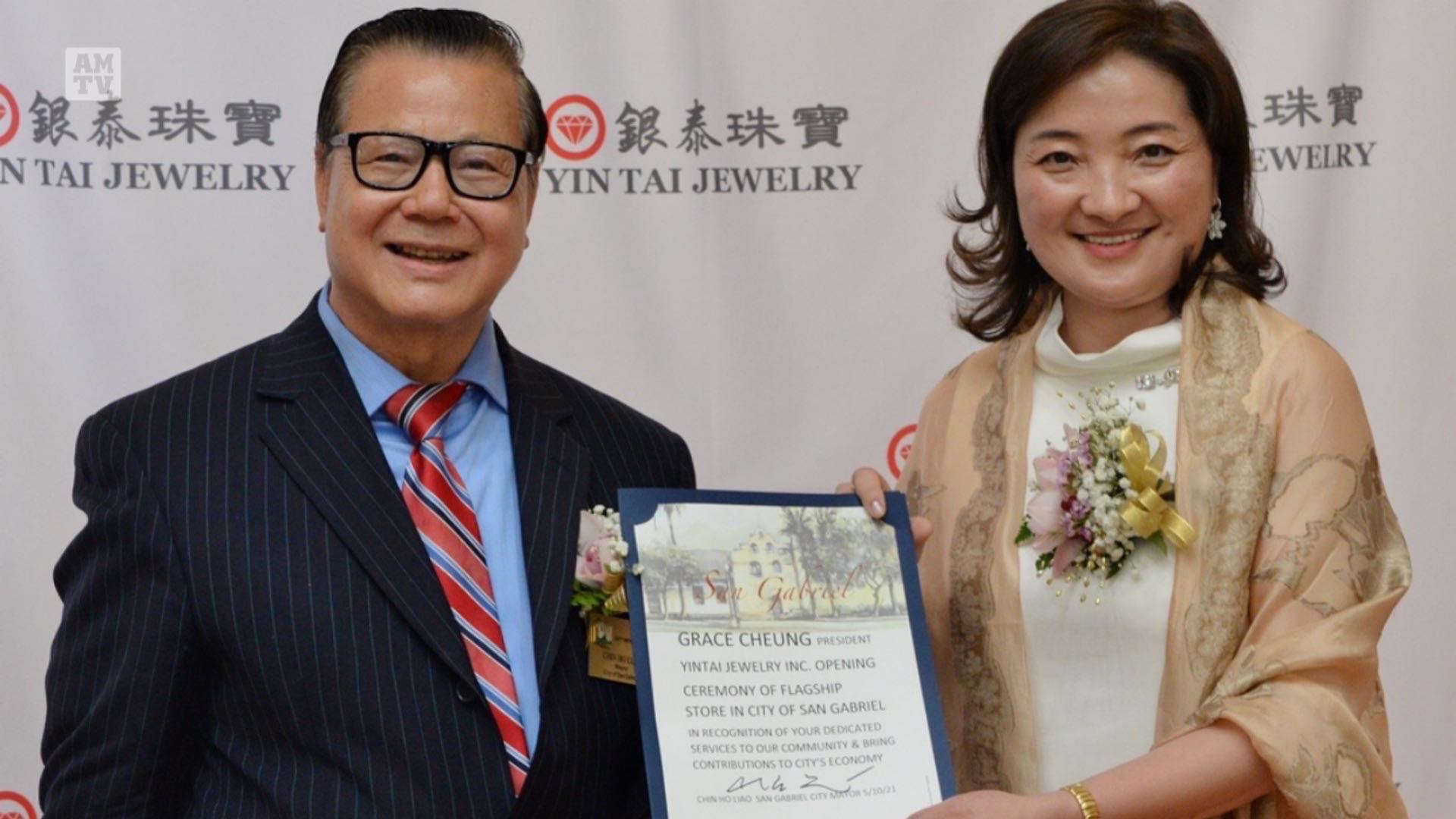圣盖博市市长廖钦和、亚凯迪亚市市长戴守真、南帕萨迪纳市市议员迈克尔·卡乔蒂 出席剪彩典礼,幷向银泰珠宝董事长张娴颁发贺状,对银泰珠宝扩大营业隆重开张表示热烈祝贺,开幕活动由丁丁主持。