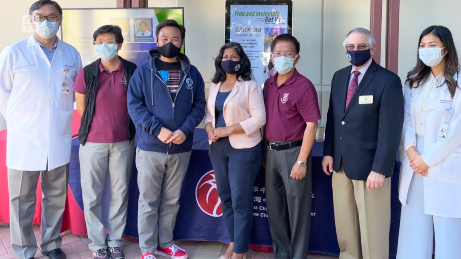 尔湾市为华裔社区举办疫苗接种站,现场义工包括(图左起):医师陈建维、校长钟幼兰、市议员郭正明、市长康恩、理事长陈景星、市议员艾格伦及医师卢美霞