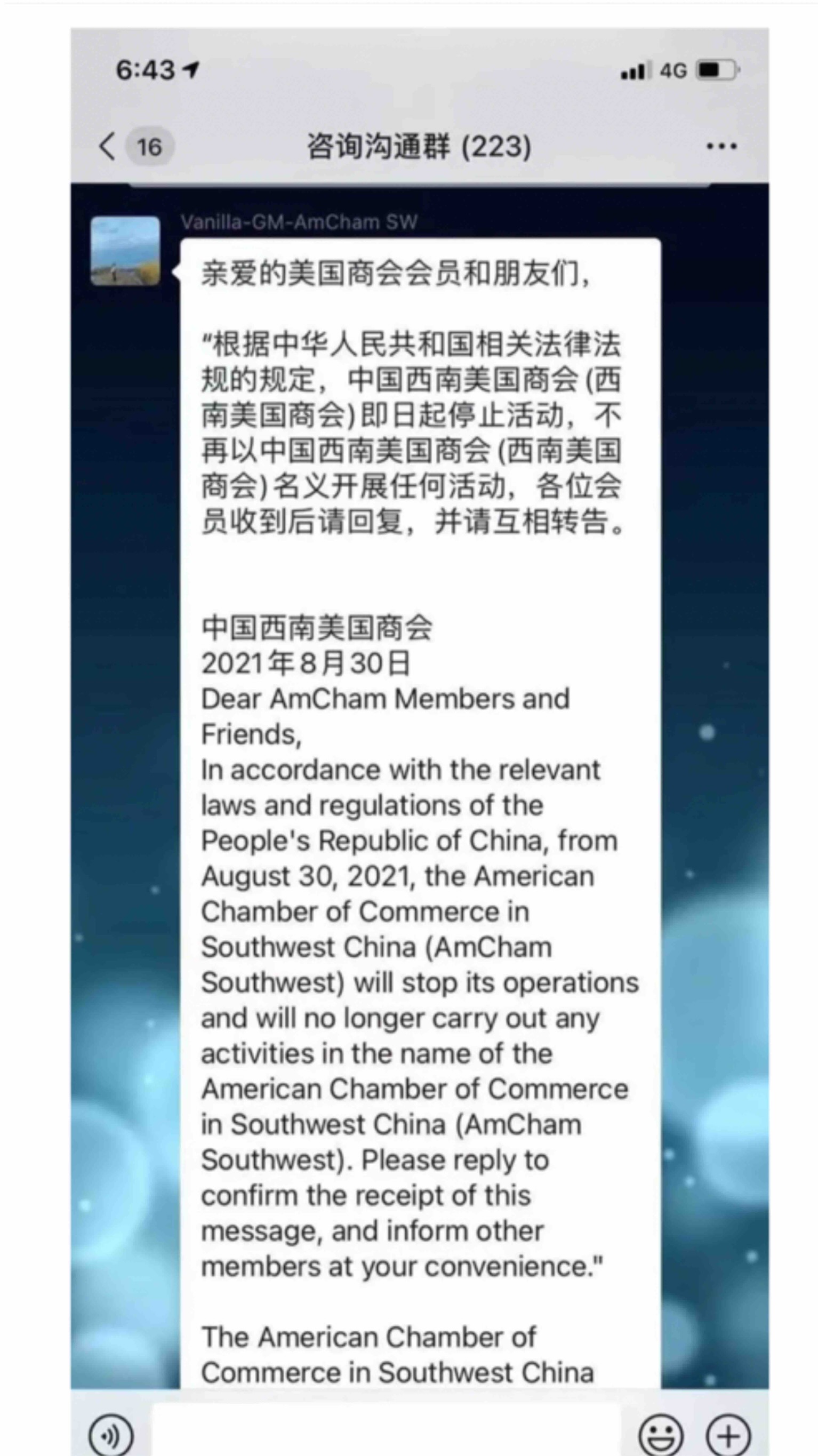 一份在中国社交媒体微信上流传的聊天截图内容显示:“根据中华人民共和国相关法律法规的规定,中国西南美国商会(西南美国商会)即日起停止活动,不再以中国西南美国商会名义开展任何活动。” 该声明时间是2021年8月30日,同时表示希望各会员收到后回复,并互相转告。