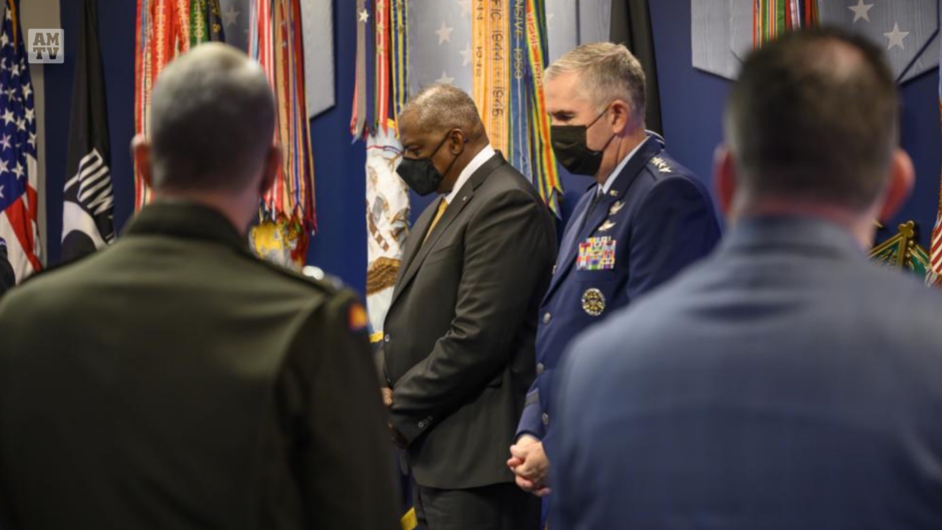 奥斯汀和美国空军参谋长联席会议副主席约翰·海滕在华盛顿五角大楼举行的国家战俘/失踪人员表彰日仪式上低头默哀。