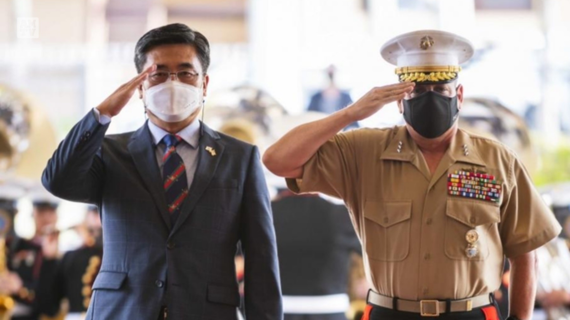韩国国防部部长徐旭在美韩举行纪念仪式后,访问夏威夷史密斯军营,向美国印度太平洋司令部官兵致意。