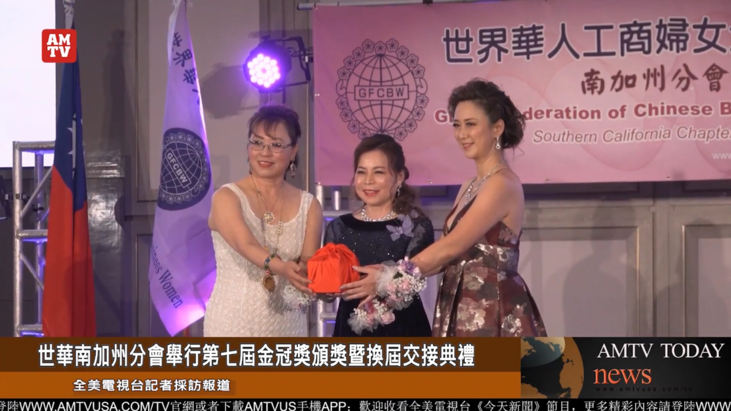 全美电视3月5日洛杉矶报道,世界华人工商妇女企管协会第七届金冠奖典礼暨23、24届南加州分会换届交接仪式今天在洛杉矶圣盖博喜来登酒店隆重举行。南加州政商学各界近500位嘉宾出席了当天的活动。颁奖典礼前,首先举行了世华 南加州分会的换届仪式,第23届会长唐久月将会章和责任链移交给24届会长裴映棋,新的一届管理团队正式接棒亮相,她们分别是监事长姜瑞瀛、副会长郭凯琪、郑怡薇。