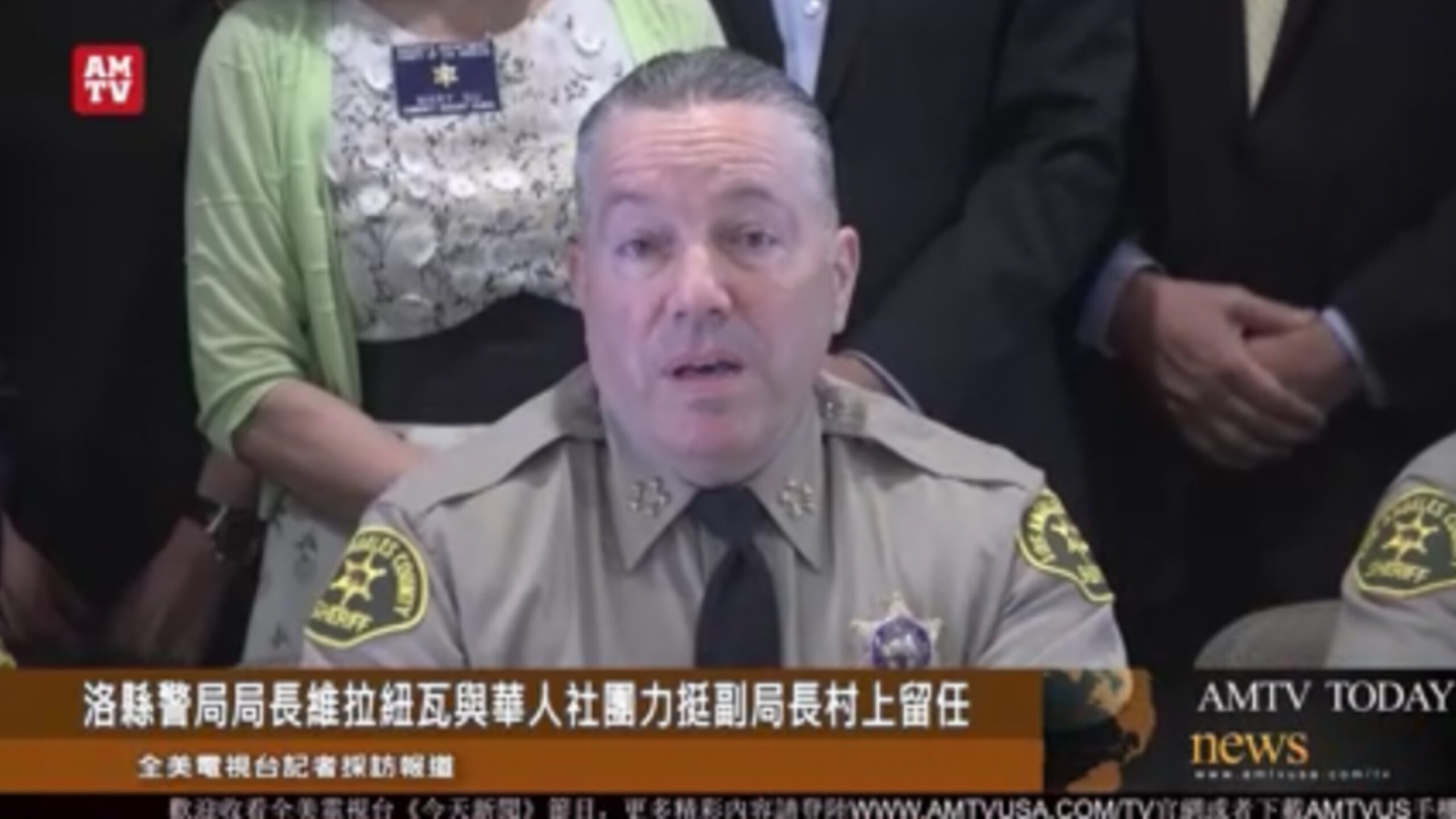 全美电视3月21日洛杉矶报道,洛杉矶县警局长维拉纽瓦今天在哈仙达岗举办华文记者会,表扬现任日裔副局长村上工作业绩,并力挺村上副局长继续留任。圣盖博谷的多位民选官员和社区领袖参加,并为村上颁发感谢状,共商应对犯罪、歧视及游民问题,以及加强亚裔社区警民合作重要性,
