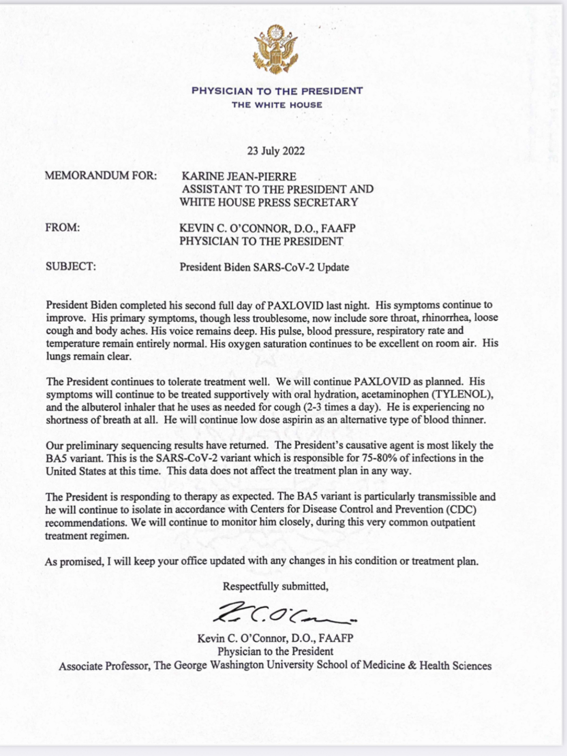 白宫今天公布的一份奥康纳医生的信函中说,拜登正在用口服泰诺和沙丁胺醇吸入器来补充治疗,“他在咳嗽时需要使用”。奥康纳医生还说:“他的声音依然低沉。他的脉搏、血压、呼吸频率和体温都完全正常。在室内空气中,他的氧饱和度仍然很好。他的肺还是清澈的。”