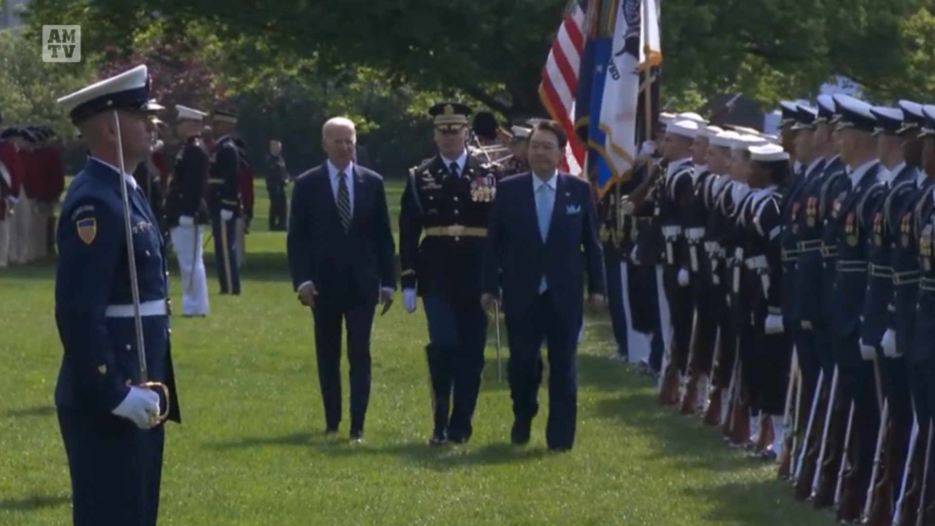 全美电视4月26日白宫报道,拜登总统今天上午在白宫南草坪举行隆重的欢迎仪式和阅兵式,欢迎韩国总统尹锡悦(Yoon Seok-Youl)对美国进行国事访问。在此之前,拜登总统和第一夫人吉尔今天上午陪同尹锡悦总统夫妇在朝鲜战争纪念馆敬献花圈。