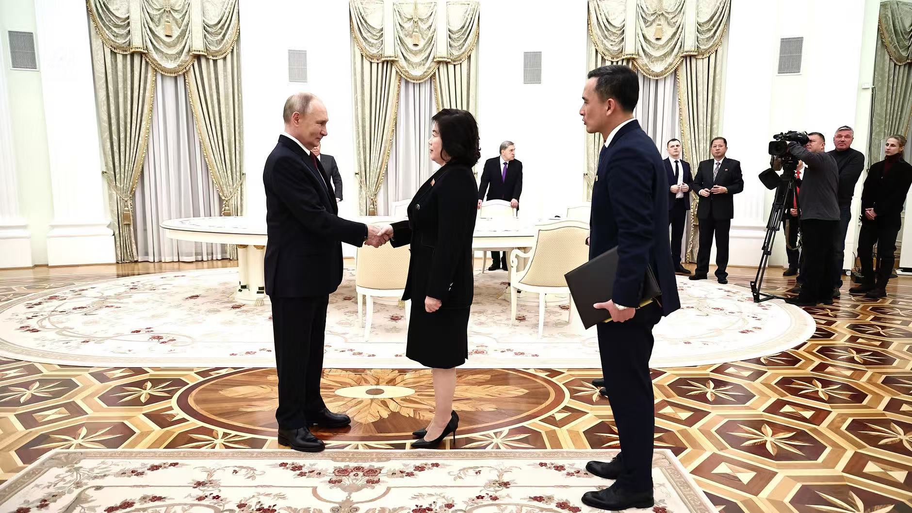 普京会见朝鲜外长崔善姬 DPRK朝鲜Moscow莫斯科NEWS新闻 By AMTV 0 全美电视11月4日莫斯科报道,俄罗斯总统普京(Vladimir Putin)今天在克里姆林宫会见了朝鲜民主主义人民共和国外交部长崔善姬(Choe Son Hui)。 俄罗斯外交部长拉夫罗夫(Sergei Lavrov)和总统助理乌沙科夫(Yury Ushakov)参加了会见。 此前,俄罗斯外长拉夫罗夫和朝鲜外长崔善姬也在莫斯科举行了会晤。 0 分享按钮