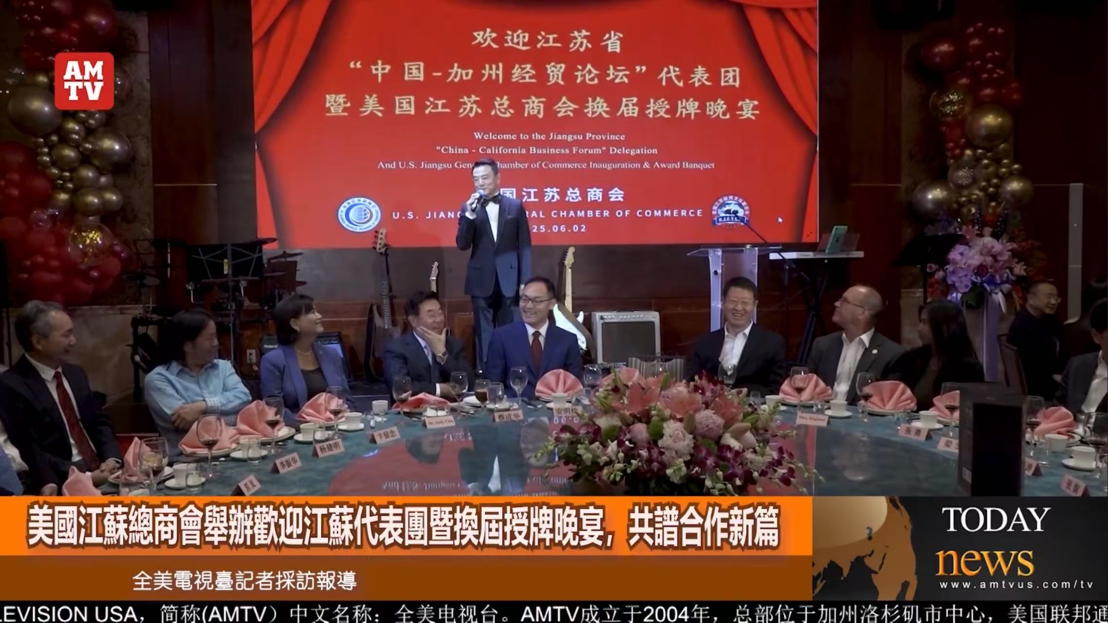 安明栓领事致辞时,以江苏与洛杉矶纬度相近、物产丰饶为引,热忱欢迎江苏代表团,展望两地广阔合作前景,强调合作将惠及两地民众。他高度肯定美国江苏总商会影响力,赞扬创会会长蔡成华、现任会长徐晓峰为侨社所作贡献,寄语徐晓峰带领新一届商会再创佳绩。