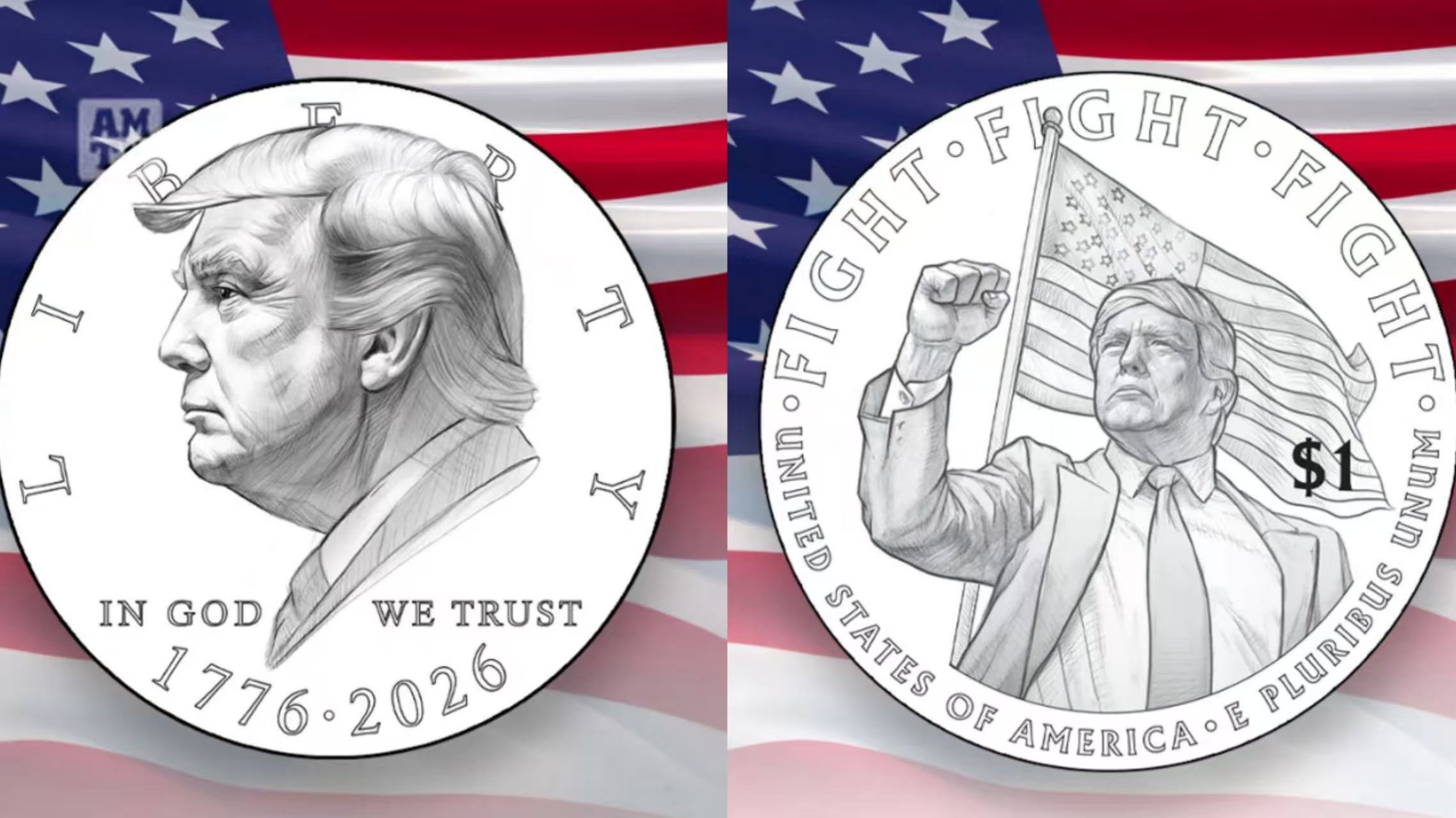 美国财政部的一份纪念币草稿描绘了特朗普总统站在美国国旗前,高举拳头的形象,该草稿中的特朗普总统的图像与他去年在宾夕法尼亚州遭遇暗杀时耳朵受伤,被特勤局特工护送下台时所作反应的一张广为流传的照片十分相似。