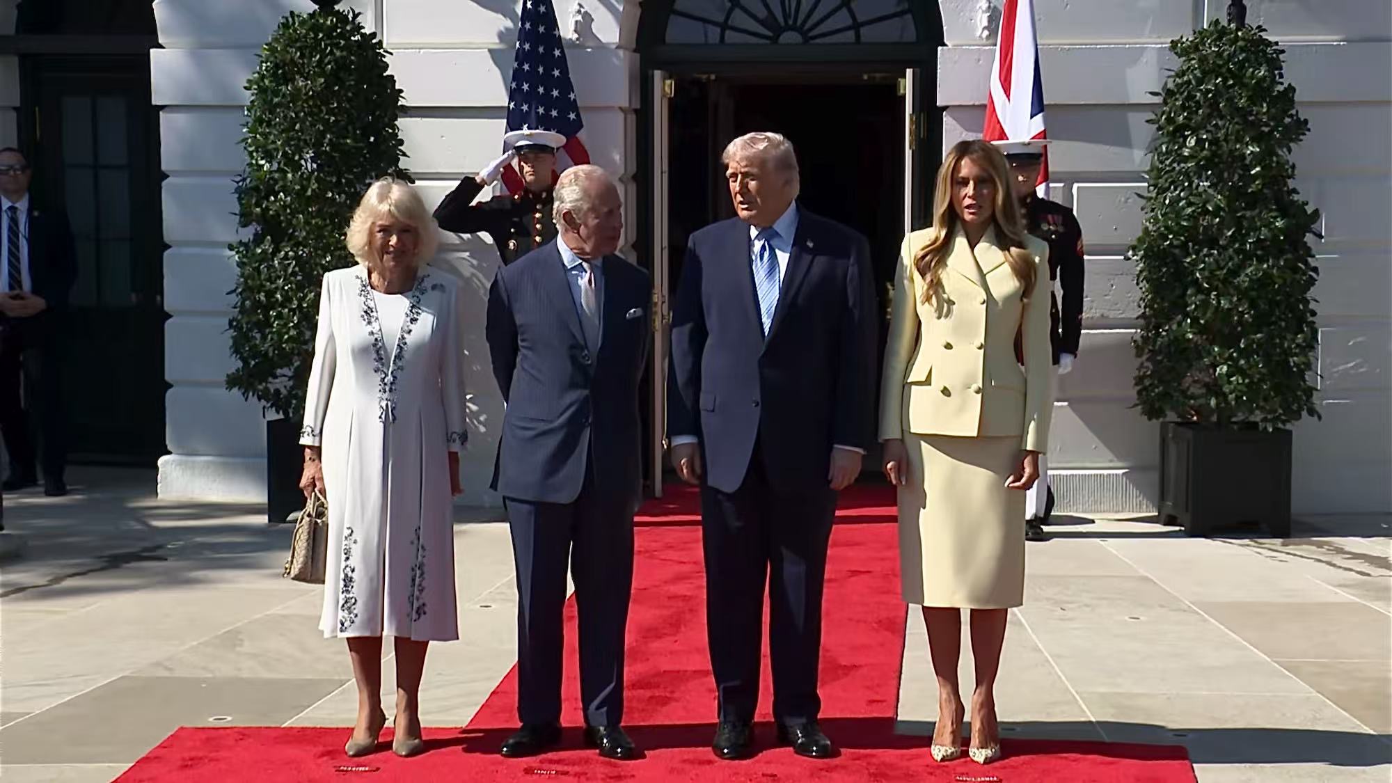 特朗普总统与第一夫人梅拉尼娅在白宫迎接来访的查尔斯三世国王与卡米拉王后,共进下午茶。